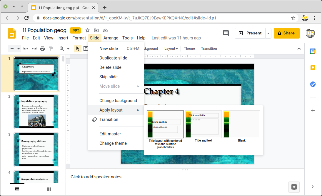 The presentation is the third application in Google’s office suite. Like Docs and Sheets, new documents are created in a proprietary format, GSLIDES. The nine menus and taskbar are available to these documents and PowerPoint formatted presentations (PPTX) that have been uploaded to Google Drive.