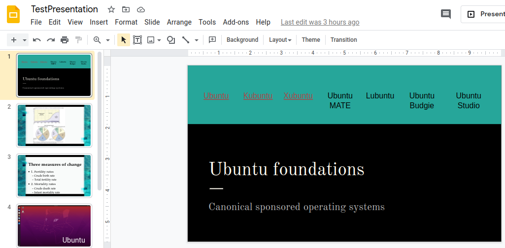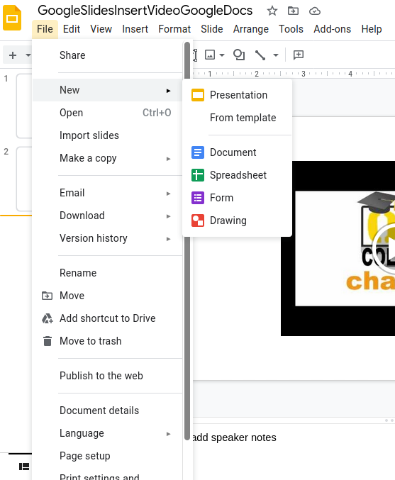 Like in Docs and Sheets, this menu is only available in Google formatted documents. The menu will not be present in Microsoft formatted documents. Other types of documents, such as OpenDocument Presentation are converted into a Google format when the are opened for the first time.